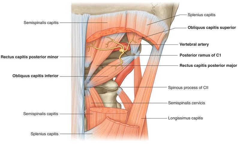 | geen deel van plexus | n. suboccipitalis | C1, rr. posteriores | cf. occipitale driehoek | |