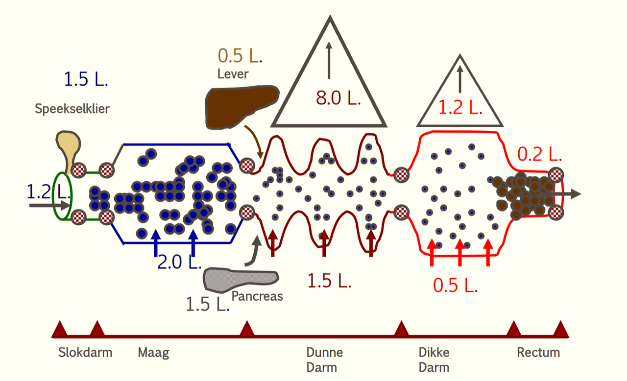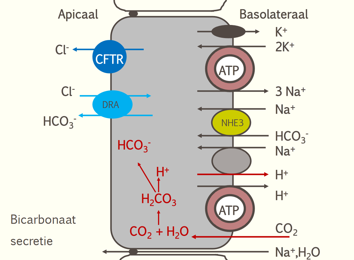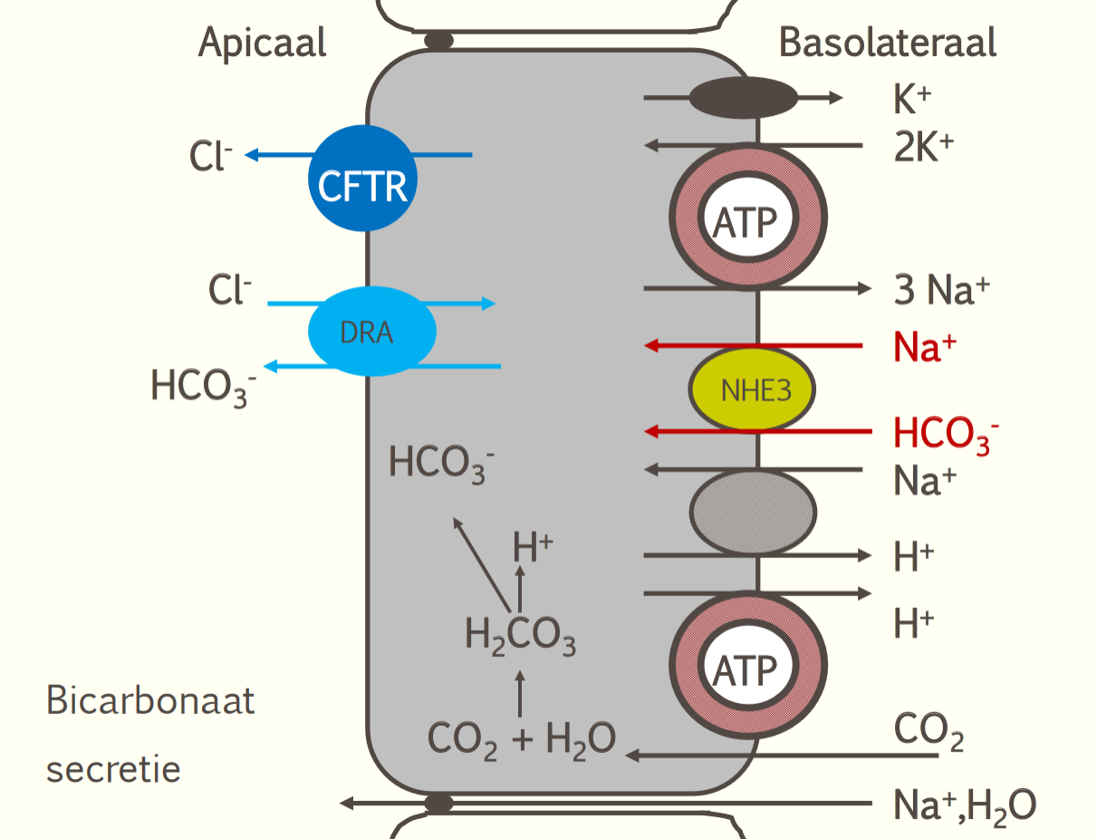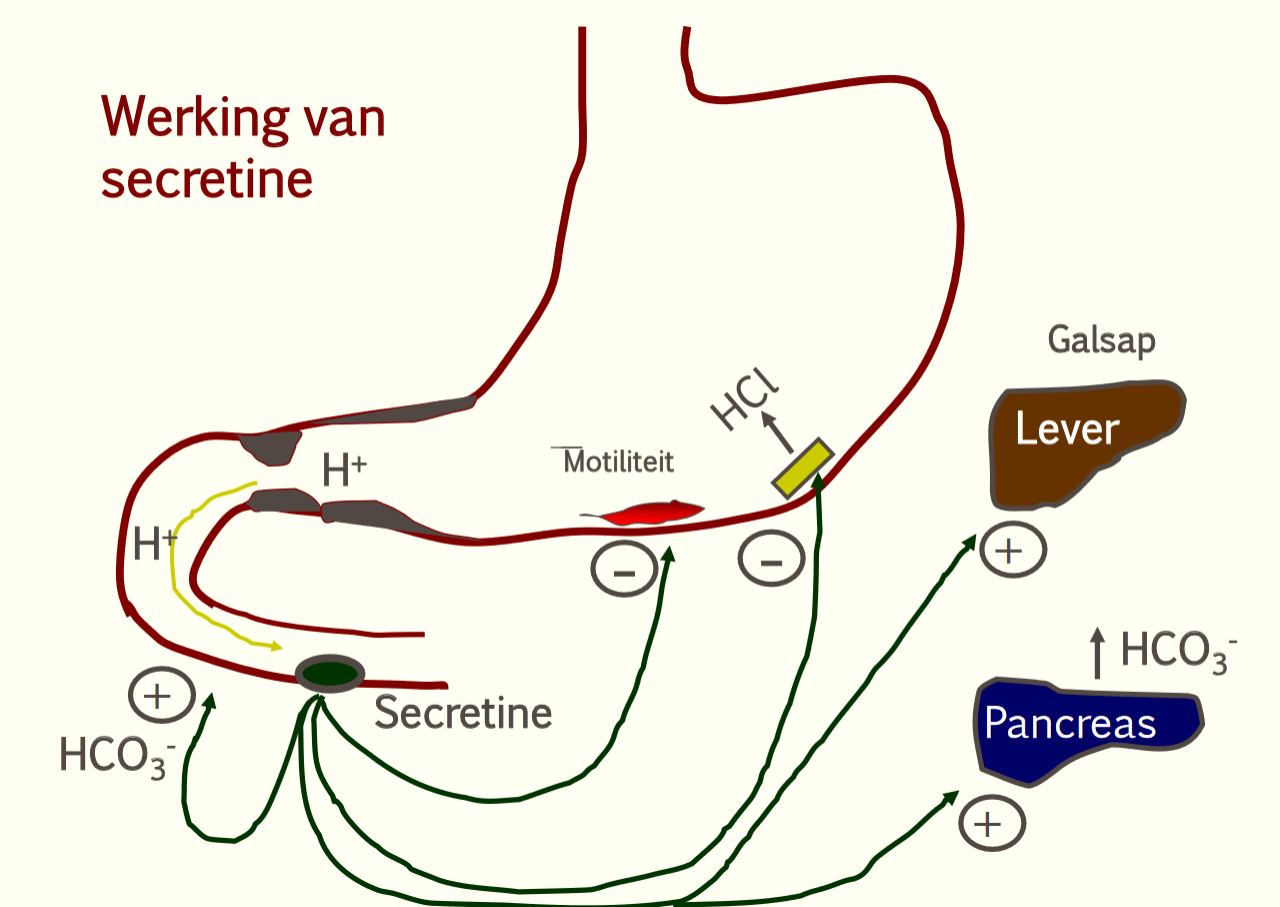 | secretine | darm | S cel | zuur | activatie D cel, minder maagzuur, maagmotiliteit, meer HCO3- in darm en pancreas, lever: meer galsap | ||