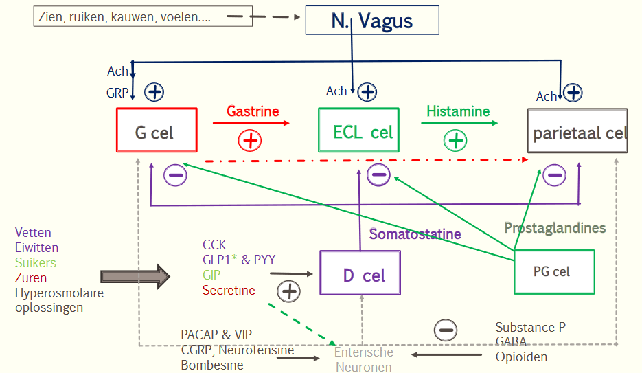 | histamine | maag | ECL (enterochromaffien like) cel | H2 | Ach, gastrine | activatie parietaal cel | paracrien |