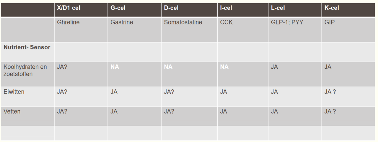 | GIP | proximale darm | K cel | vooral koolhydraten | minder NPY, AgRP, meer insuline | incretines, minder eetlust | |