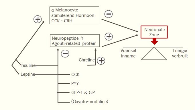 | leptine | vetweefsel | voedselinname | minder NPY, AgRP, meer alpha MSH, CCK, CRH | minder eetlust | ||
