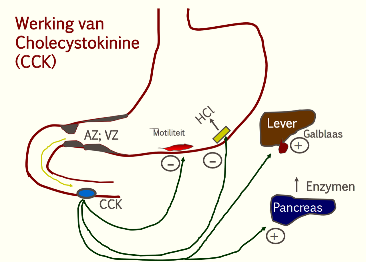 | cholecystokinine (CCK) | darm | I cel | CCK2 | eiwit, vet | minder NPY, AgRP, anorexigeen, verzadigingsgevoel | minder eetlust, minder maagzuur, maagmotiliteit, meer pancreasenzymen |